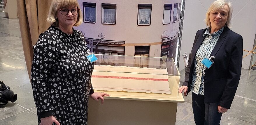 Die Bürgermeisterin Frau Marlies Cassuhn und die Museumsleiterin Mary-Anette Pilz folgten der Einladung des Deutschen Bundestages und des Freundeskreises Yad Vashem. Dort konnten sie das Handtuch mit der Aufschrift "Fröhliche Weihnachten von Herm. Laufmann Wolmirstedt 1928" betrachten. Das Exponat wurde mit einer zeitgenössischen Fotografie vom ehemaligen Laden der Familie sowie Bildern aus der Lebensgeschichte der Familie präsentiert.
